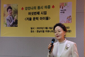 [중소기업투데이 황복희 기자] 햇살 좋은 5월 둘째날. 서울 한남동 한 고급주택단지 커뮤니티센터에서 조촐한 출판기념회가 열렸다.강안나 시인의 여섯 번째 동시집 ‘겨울 문턱 아이들’(도서출판 브로콜리숲)의 출간을 축하하는 자리로, 시인의 여고동문들과 지인 등 40여명이 자리를 함께 했다. 이날 낮12시, 분수가 시원하게 흐르는 야외공간을 지나 커뮤니티센터 2층 작은 홀에 들어서자, 경상도 사투리가 두런두런 들리는 가운데 테이블에는 생수와 간식, 그리고 새로 세상에 나온 시집 ‘겨울 문턱 아이들’이 다소곳이 놓여있었다.참석자들의 절반은