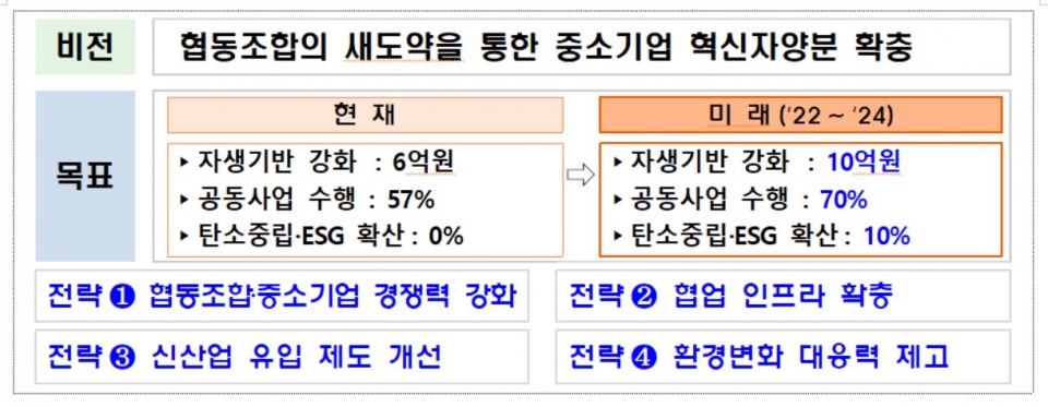 협동조합 간 협업 인프라 확충을 위해 민간기업의 기부금도 끌어들인다. 중소기업중앙회가 중심이 돼 대·중견기업 등 민간이 참여하는 1000억원 규모의 ‘자발적 상생자금’을 2024년까지 조성한다는 계획이다. 이는 공동시설 구축과 탄소중립, ESG 공동 대응 등의 소요 재원으로 쓰인다.