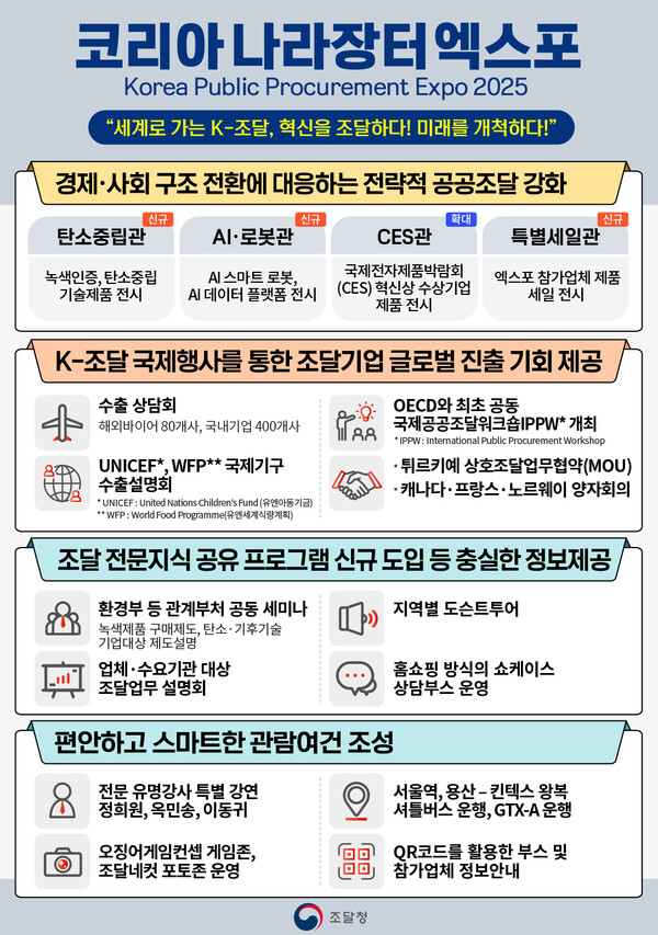 올해 ‘코리아 나라장터 엑스포 2025’는 ‘벤처․혁신기업의 판로개척·글로벌 시장 진출, 공공기관·국민의 우수조달제품 만남의 장’ 이라는 목적에 충실할 수 있도록 전략적 공공조달 강화,다양한 국제행사 개최,전문 정보제공·편리한 관람여건 조성 등 예년보다 더욱 알차게 꾸렸다.