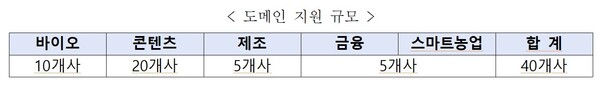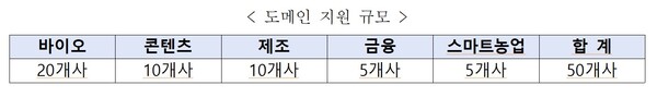 바이오 등 AX 기술을 통해 경제·사회적 성과 창출 가능성이 높은 ❶바이오, ❷콘텐츠, ❸제조, ❹금융, ❺스마트 농업 등 5대 핵심 도메인의 고도 기술을 보유한 혁신 AI 스타트업 50개사를 선발한다. 선발된 기업에는 도메인 AX 모델 개발과 기술 고도화 등 기술사업화 자금 최대 1억원을 지원한다.