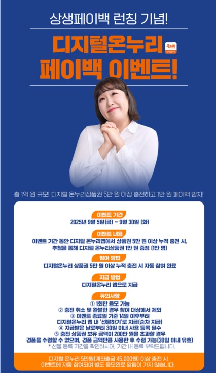 아울러 상생페이백 론칭 기념으로 이달 30일까지 디지털 온누리 앱에서 상품권을 누적 5만원 이상 충전하면 추첨을 통해 1만원의 상품권을 총 1만명에게 지급하는 이벤트를 진행한다.