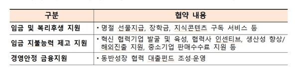 주요 협약 내용으로 협력사의 근로환경 개선을 위해 영화·공연·스포츠 등 문화생활과 복리후생 등을 지원하고, 협력 중소기업 대상 1억 원 규모의 장학금과 심리상담, 지식콘텐츠 구독 서비스 등을 신규로 시행해 협력 중소기업 임직원의 사기진작 및 장기재직을 유도한다.